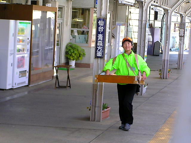 右は2005年5月25日、常磐線原ノ町駅の立売風景。女性が頑張っています。