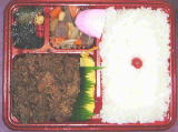 | ピンボケしてますが以前買った事がある斗牛弁当の味に最も近い牛丼です。 この頃は宇和島駅横のコンビニ「エルスター」でおむすび屋片山さんの弁当が数多く買えました。(2005年12月31日投稿・2004年6月26日撮影) |