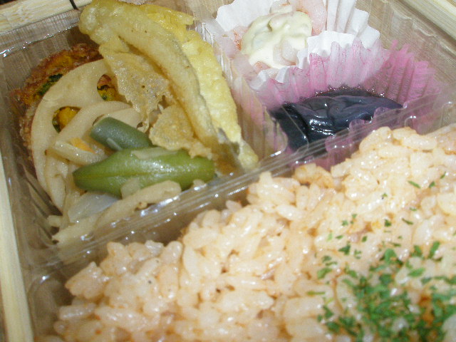 おかずは夏らしくカボチャを使用したチーズフライ、ししとう、蓮根素揚げ、キスの天ぷら、茄子の煮浸し、茹で海老のタルタルソースがけ、きんぴら牛蒡など。案外さっぱりしていて夏の季節感が漂う洋風弁当と言うよりも、和洋折衷のお弁当でした。