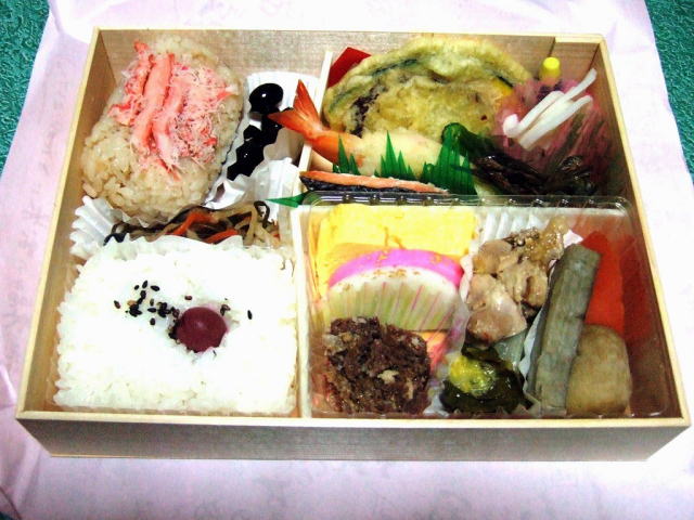 正月バージョンらしく、黒豆、田作り、紅白かまぼこなどが入っています。笹には、かにめしが入っています。出してみました。」