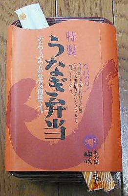 いずれも浜松駅構内で売られている、正式には駅弁でない「うなぎ弁当」です。値段は上の「浜名湖山吹」が1050円、下の「コスタ浜名湖」のものが850円ですが、蒲焼きの枚数によるようです。どちらも保温機の中に入れられて売られていました。