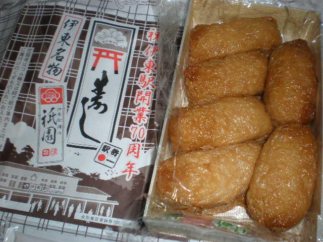 下は2007年10月20日、伊東駅売店に置かれていた「びゅうスペシャル弁当伊東名物祇園のいなり」。びゅう商品のため、一般売りはありません。びゅう企画ツアー参加の中で、引換券で交換できる弁当です。