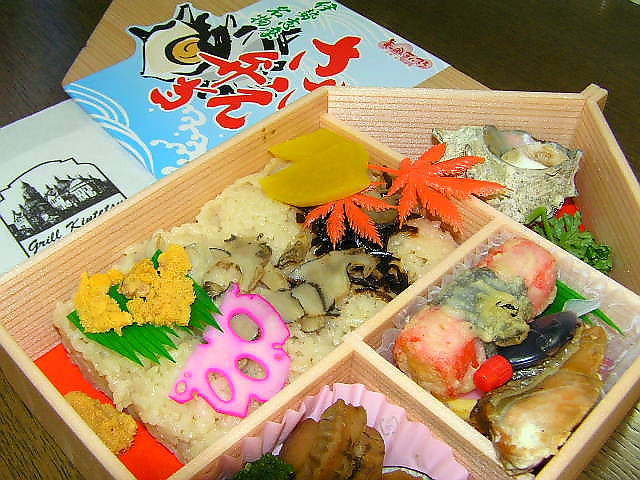「さざえ弁当」はさざえの炊き込みご飯にさざえのつぼ焼き、さざえの煮付け、蒸しウニ、トコブシ、ホタテ貝柱、鮭塩焼き、昆布巻き、塩吹き昆布、磯辺フリッター、酢蓮根、ブロッコリーなど、目に鮮やかでかつ豪華、しかも美味しいです。容器の形もユニーク。