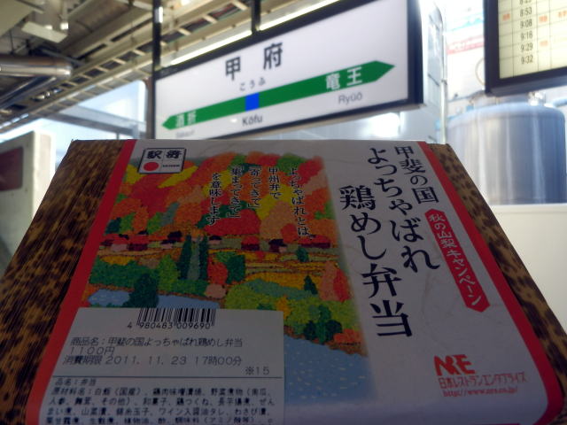 下は2011年11月23日、甲府駅で購入したNRE「甲斐の国よっちゃばれ鶏めし弁当」1100円。2011年秋の山梨キャンペーン開催を記念して2011年9月1日から12月4日まで駅弁です。