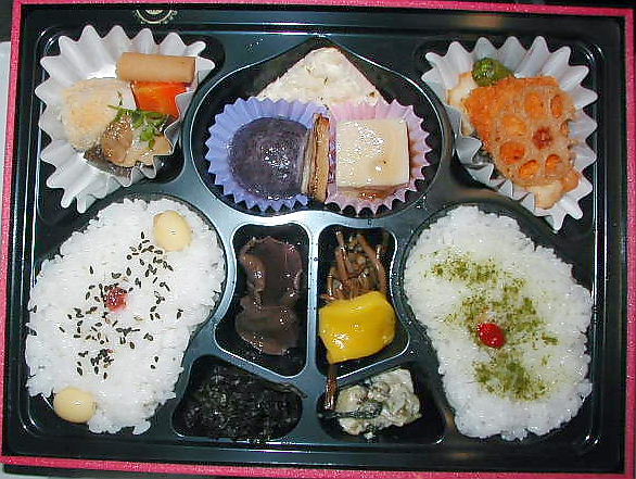 湯葉のフライ、山芋磯辺、アップル焼き、小芋落花生和え、黒米蒸し、野沢菜入り山葵漬け、天然あみ茸などをおかずに、甘酢に漬けたくこの実をのせ抹茶塩でいただく織部ごはん、甘酢煮したハスの実とかつお梅を添えたハスの実ごはんの会席お弁当です。