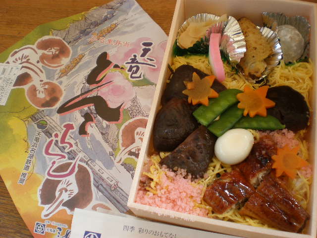 薩摩芋が入っていたり、栗があったり、舞茸の天ぷらなど、季節感はありますし、肉団子や野菜の煮物など、おかずの数も多いですが、そこまで凝らなくて良いから大ぶりの椎茸煮や鮎の塩焼きを思い切って入れるなど、もう少し地域の特性をアピールしたような内容が欲しいです。自分が天竜二俣からさらに奥、佐久間に5年間住んでいた思い入れもあって、少し注文が過ぎてしまったかもしれませんが。。。