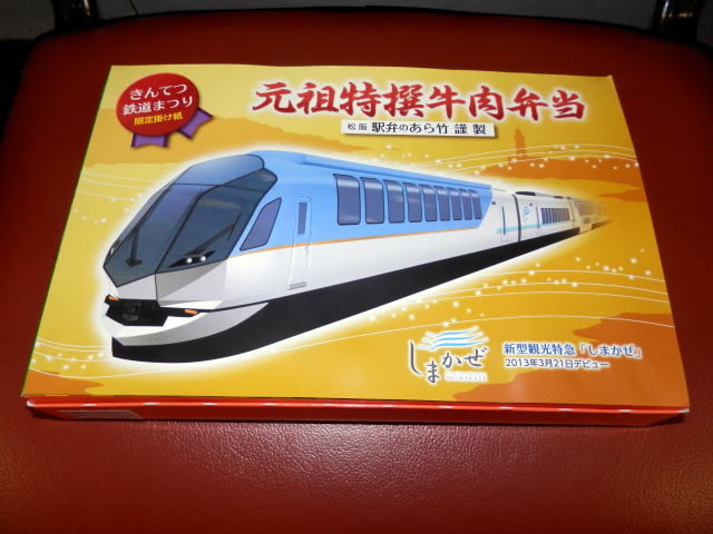 下は近鉄鳥羽駅で出発を待つ「しまかぜ」。いつか乗ってみたい豪華な観光特急です。次は、伊勢神宮遷宮を記念した鳥羽駅の記念駅弁を見てみましょう。