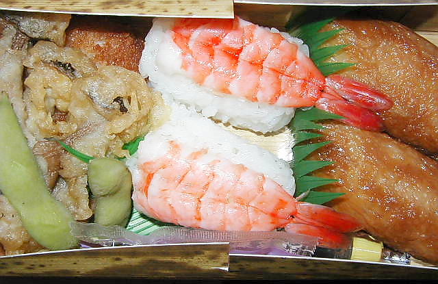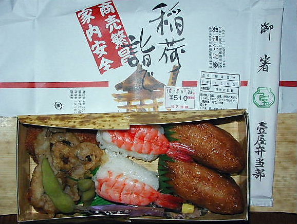 ちょっと小腹が好いた時にはうってつけの駅弁です。名物のいなり寿司に縁起物の海老寿司が共に2個ずつ。おかずはしめじの天ぷら、カニクリームコロッケ、枝豆です。