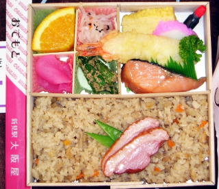 大阪屋さんに予約の段階で聞いたところ、2007年になってから復活したそうです。カモ肉や海老天ぷらなどのおかずはさることながら、たきこみごはんが本当に美味しくて大感激。掛け紙には「むかし、むかし・・・ふる里の味、たきこみ弁当の大好きな鬼がおりました。桃太郎は、きび団子と交換してくれるようにたのみましたが、鬼は全部たいらげてしまいましたとさ・・・めでたし・・・めでたし・・・」と書かれていました。そのお伽噺は冗談だとしても、それぐらい美味しいというのには納得できました。