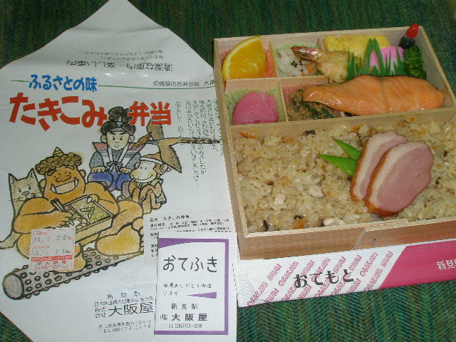 というわけで、2007年8月2日のその時が来ました。下は「特急やくも18号」の車内販売から購入した復活「たきこみ弁当」1100円。「伯備線のお弁当屋 大阪屋」 0867−72−0218。