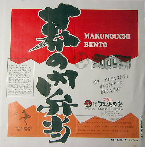 下は2002年FIFA(日韓共催サッカーワールドカップ)記念の幕の内弁当です。鳥取の地にエクアドルがキャンプを行ったことに因んでいます。