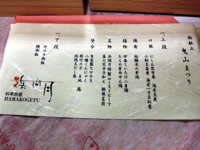 5月24日、賤ヶ岳SAで購入。2700円。包みを開けてみました。大きい方がおかず、小さい方がご飯です。お品書きがあります。
