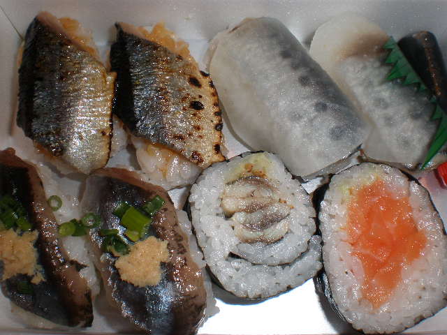 下は2009年1月18日、京王駅弁大会で購入した「いわしのほっかぶり・づけサンマ・サーモン・炙りさんま甘辛握り」。
