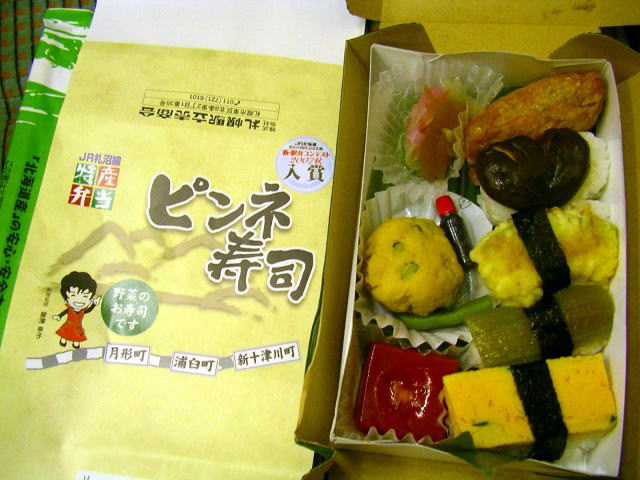 下は2007年10月、大阪だるまさんが札幌駅で購入した「ピンネ寿司」。貴重な画像どうもありがとうございました。札沼線の月形・浦臼・新十津川3町の特産物を使った野菜の寿司です。「ピンネ」とは、この3町から見える山の名前とか。