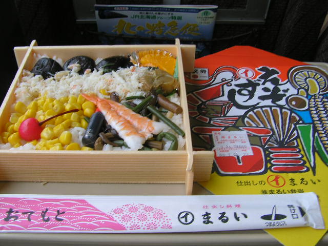 特急「北斗」の中でいただきました。かに、コーン、帆立。あとは椎茸、山菜、海老のちらし寿司。デザートにサクランボ、みかん。