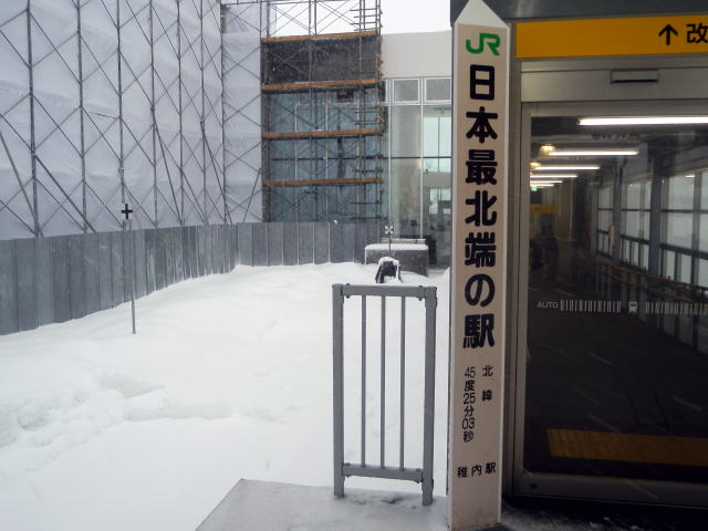 上の写真を駅舎側からではなく、ホーム側から見ると下の写真のような感じです。ご覧の通り、駅舎は改築工事中で、まだその全容を現してはいません。ホームは片側1本のみの最果ての駅。「日本最北端の駅」と書かれた柱が旅情を誘います。