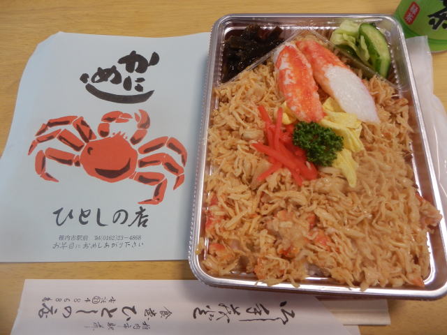 カニはズワイではなく、たぶん見た感じだと花咲ガニだと思います。その味ですが、これがまあ何とも優しい味で、素朴さを前面に出し、なおかつ濃厚で贅沢なカニのほぐし身が敷きつめられているお弁当ですから、1500円も払っただけのことはあります。カニフレークは冷蔵庫から出していましたが、ごはんがホカホカですので、いい感じに温かくなって、列車の中で食べたらちょうどいい加減になっているだろうと思われました。