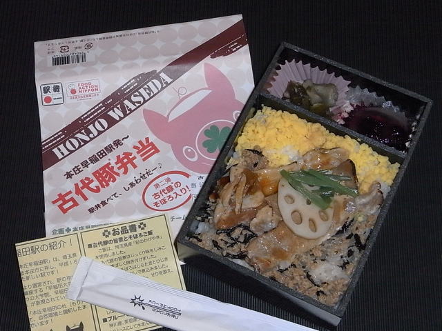 下は2009年8月9日、東京駅旨囲門で購入した「本庄早稲田駅発古代豚弁当」900円。「弁当食べて、しあわせだー」というダジャレが書かれています。