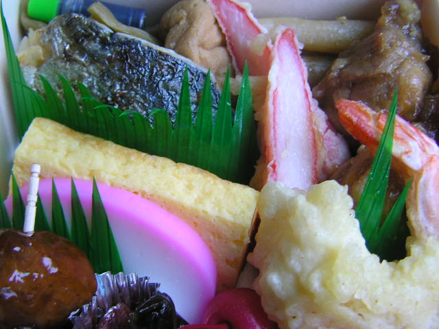 ごまを振りかけた俵ごはんが1つの折に入っており、おかずと区別されています。