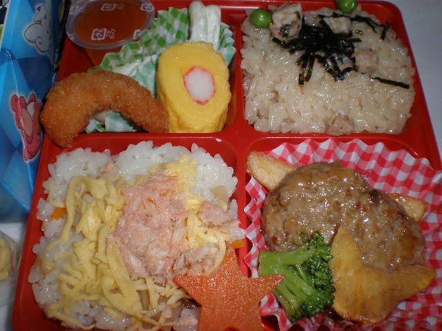 今回はカレーピラフ、チーズとハムの入った丸パンサンド、ハンバーグ、キャベツとコーンのサラダ、星形の青海苔入りポテトフライ、、ゼリーなど。