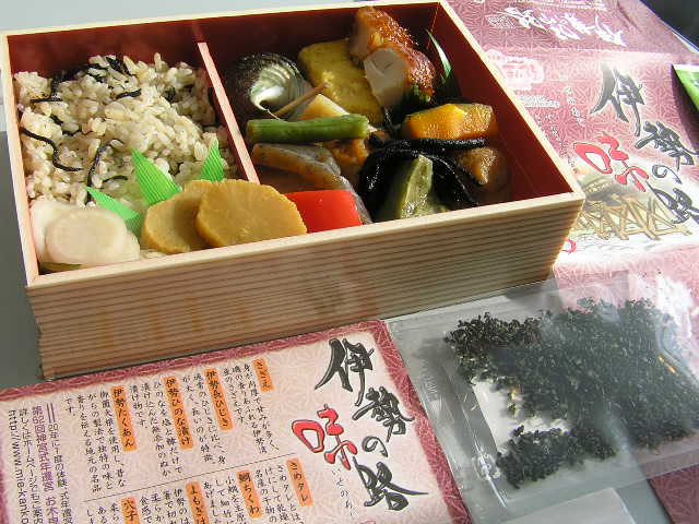 2006年12月20日より2007年3月末まで期間限定で売られる、伊勢志摩の食材を詰め込んだお弁当です。伊勢産ひじき炊き込み御飯、サザエつぼ焼き、伊勢鶏の照り焼き、伊勢醤油で味付けた野菜の煮物、伊勢の珍味の「サメタレ」という鮫の干物、伊勢沢庵漬、穴子八幡巻、ねじりこんにゃくなど。