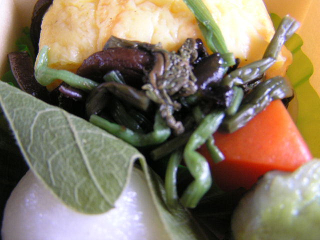 下の折はおかず。こちらは正真正銘の「かしわ餅」がありました。さらに、緑色が目に優しいサワラの木の芽焼、、だし巻き玉子、春の山菜、椎茸旨煮、甘煮人参。