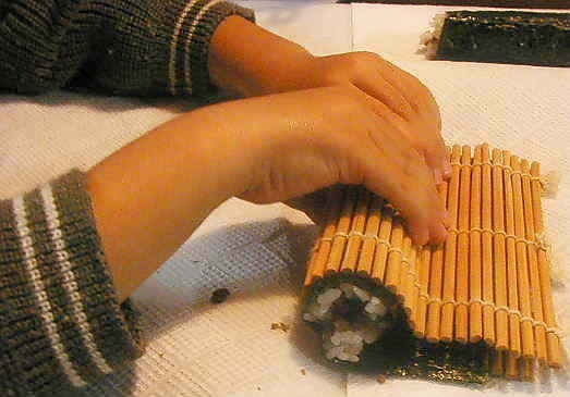 のりをしいて、ごはんをおいて、おにくをかけて………と。