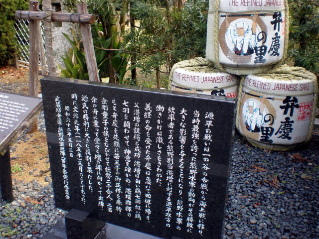 闘鶏神社の境内にあった「弁慶」像と「弁鶏」とのツーショット。弁慶の右隣は父である熊野別当湛増でしょうか。石像の左横には「弁慶の里」という清酒樽も見えます。