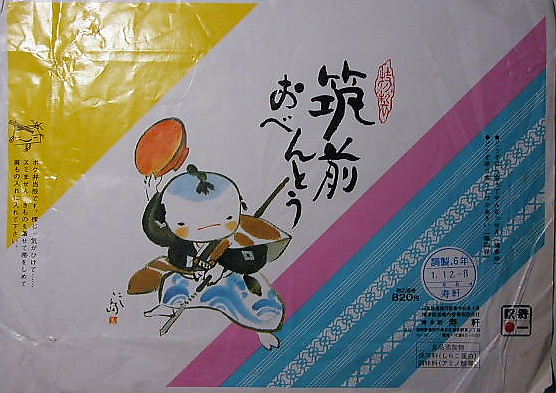 下は1994年1月12日。博多の名産品であるめんたい、おきうと、焼きぎんだら、えびの唐揚げ、ひじきの袋煮、いかの照焼などが入っているお弁当。掛け紙は黒田節。