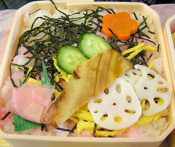 ごはんの重には桜でんなぶをちらしたちらし寿司の上にあなご、酢蓮など。