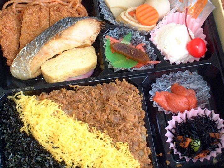 かしわめしに加えおかずは、チキンカツ・スパゲティ・焼鮭・野菜煮物・ポテサラ・明太子・ひじき煮などでした」