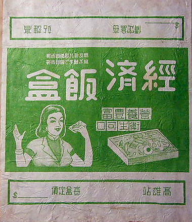 台湾の高雄駅。1970年前後。おそらくそれ以前でしょうがよくわかりません。イラストによるとご飯の上に肉やゆで卵、魚などが散らされたお弁当のようですが…。