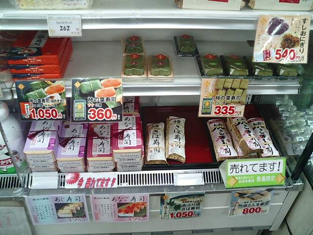下は2007年2月26日、東名高速道路牧之原SA上り売店で購入した「柿の葉寿司」。京都の業者「京都加悦(加悦ファーマーズライス)」ですが、日持ちするためか、輸送しているようです。鮭、鯖が4個ずつ。1050円。