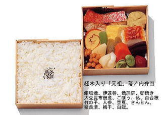 | ↑明治22(1889)年、姫路駅で売られた日本初の幕ノ内弁当の再現(画像提供・まねき食品) |