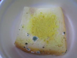 からしシート↑(置き方のミスで字が逆になりました。^^;)。シートの回りが黄色くなってきていて、これは成分が食パンに含まれた水分によって流れ出したということでしょうか。そうでないことを祈りますが、もし万が一そうだとしたら、食材にからしの味が移ってしまうこともあるのかも知れません↓[3日目] 。