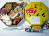 日タイ修好120周年記念「おめでタイ弁当」を新宿駅で入手。おまけのパイナップルジュース、ちびタイ(旅の指さし会話帳)が付いて1,000円です。今頃真夏日となった今日の東京にはぴったりな一品でした。タイカレー好きの私としては無性に辛いグリーンカレーを食べたくなってしまいました。タイシルクを敷いて、ちょっとそれらしい感じでしょ! ↓上ちゃんのレス 痛筋痒足さん、いつもながら芸術的な駅弁画像をどうもありがとうございます。実は私も本日ゲットしました。私が買いに行ったのではありませんが。食べてみると、1000円でよくここまで研究して作ったなあと、調製元のNREに拍手を贈りたいですね。ふだんタイ料理など食べる機会がないので、本当に新鮮な体験でした。タイ米も久しぶりに口にして、なんか感動的でした。辛くて汗をかいてしまいましたが、辛いのは好きなんで、全く気になりません。黄豆が甘いし、パイナップルジュースもさっぱりさせてくれます。しかも、「ちびタイ」が手違いからか2冊入っておりました。ラッキーです。 |