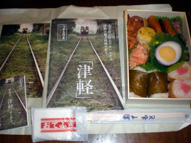 は終売していますし、海底駅がなくなると青函エリアは通り抜ける場所となってしまいがちです。そこで、五所川原に因んだ駅弁を2つ紹介します。下は2010年12月5日、新青森駅開業記念東京駅駅弁大会で購入した新青森駅「太宰治生誕100周年記念弁当津軽」。800円。