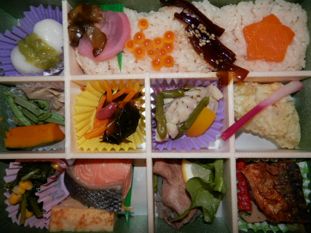 「2012年6月19日 同じく大宮駅「旨囲門」にて。¥1000 調製元は、盛岡の「日本レストランエンタプライズ」さん。 内容は、ご飯の上にサーモン塩焼・銀鮭フレーク・いくら醤油漬・めかぶとわかめの和え物・煮物(帆立・椎茸・絹さや・細竹・山ウド・ふき)・蒲鉾。玉子焼と切干大根煮、しば漬けが添えられてました。」