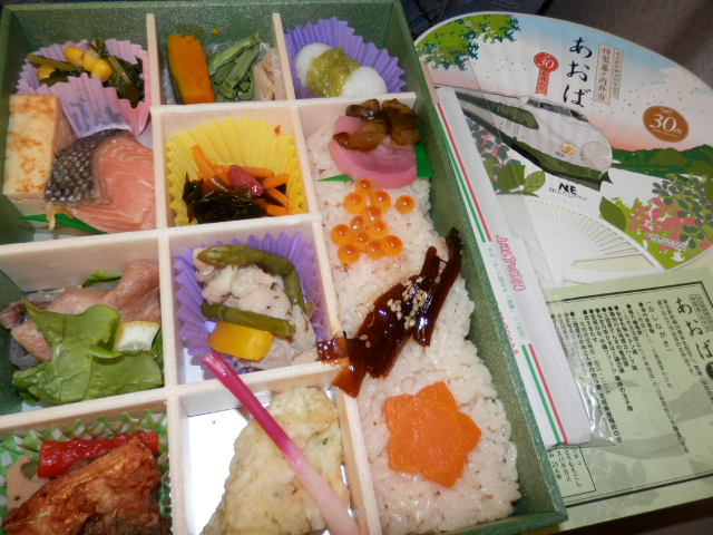 目にも鮮やかな駅弁に仕上がっています。駅弁の正式名称は「東北新幹線30周年記念特製幕ノ内弁当あおば30品目入り」だそうです。